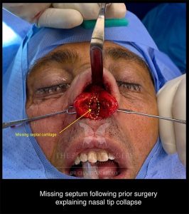 - Over-zealous removal of septal cartilage resulting in reduced nasal support and a sunken profile. This is often termed a saddle nose deformity