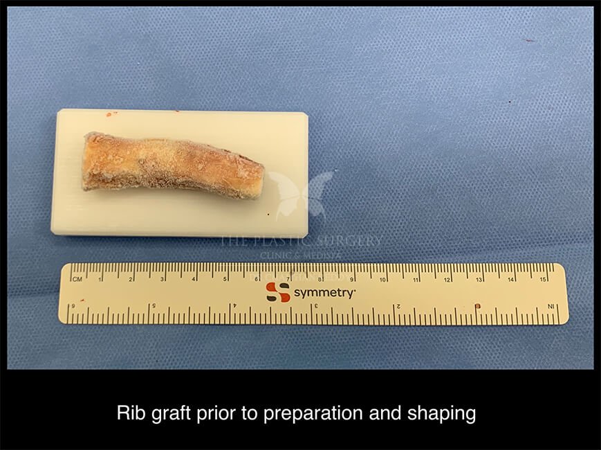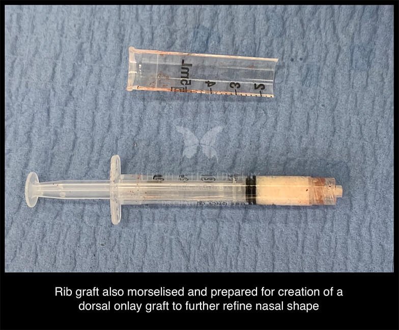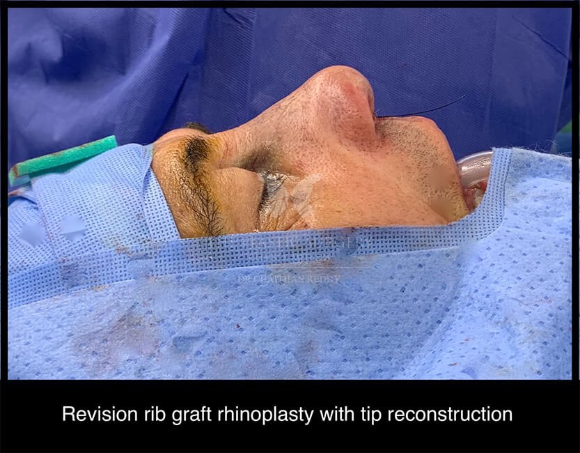 Revision surgery is generally more complicated due to the presence of scar from the original surgery. Using an open rhinoplasty technique, the skin envelope is raised off the underlying nasal cartilage and bone. Due to the presence of scar, this is undertaken in a careful and slow manner to preserve the existing cartilages and also ensure the overlying skin maintains its blood supply to support normal healing. Once the underlying cartilage and nasal bone framework is delineated, the relevant anatomical problem is identified. Correction of the deformity is then undertaken. This often requires the use of cartilage grafts to restore support and shape to the nose. Often in patients who have already had rhinoplasty, there is no spare cartilage to use to correct the deformity. Cartilage is then sourced from the ear, rib, or from artificial rib.